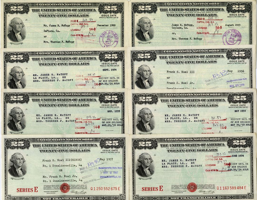Louisiana and Washington, D.C., Lot of 8, Series E, U.S. Savings bonds, all are Series E issued and cancelled bonds, George Washington at left, All were cancelled in New Orleans or Donaldsville, All are in VF to AU condition. BEP.