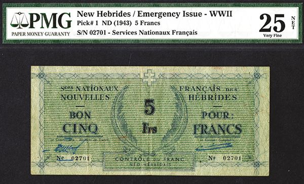 New Hebrides. Pick #1. Green. Hard to fine wartime issue. PMG graded Very Fine 25 NET with note of foreign substance, but it is difficult to see where it is.