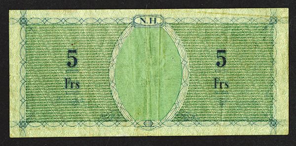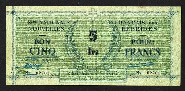 New Hebrides. Pick #1. Green. Hard to fine wartime issue. PMG graded Very Fine 25 NET with note of foreign substance, but it is difficult to see where it is.