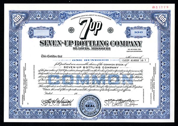 Seven-Up Bottling Co. 1977 Specimen Stock Certificate. St.Louis, Missouri. 100 Shares, Specimen stock, blue border. "7 Up" logo. Scarce certificate. XF condition. Republic BNC.