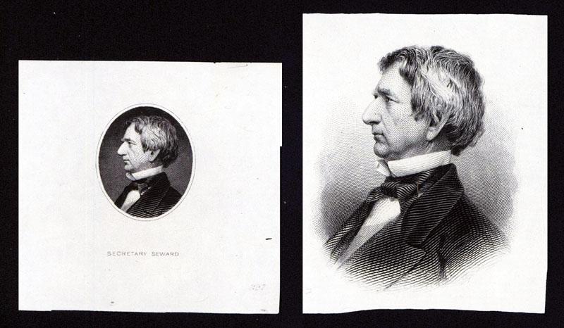 Seward Proof Portrait Vignette Pair.ND (ca.1860-80's), Lot of 2 production department working or production proofs. Both are of Secretary Seward in different sizes used for documents and the small one possibly for U.S. Treasury bond coupons. Printed by ABNC or National BNC. Both are production proofs printed on india paper for use of the production department in banknote, bond, check and fiscal document designing, both in AU to Uncirculated condition. These were for internal production use which is why they are not mounted on card. Rare Security Printing ephemera.