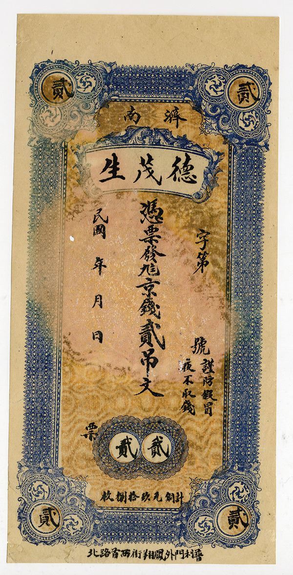 Shandong Province, China. A private banknote issued by Demaosheng Bank in Jinan, Shandong Province. No date or serial number. The text in the center says "Please pay the bearer two strings of copper cash coin at a 98% rate", and the text on the bottom says "equals to 98 10-cash coins". VF-XF condition. Pictures on the back depict oriental gardens and pavilions, with a Chinese "Two" in the center. Text on edges means "no loss registration". ________________________________Ò__________Ó____Ò_______Ó______________Ò_Ó______Ò____Ó_