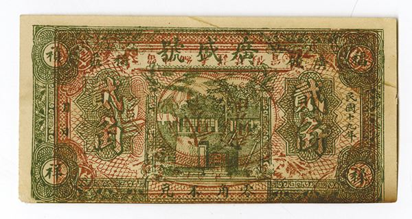 Shandong Province, China. Printing error banknote. A private 2 jiao banknote issued by Guangshenghao Bank in Guangrao County, Shandong Province in 1930. The front side also has a layer of the back side printing. The main picture on the front side is a pavilion, with bank name, date and denomination around. Back side shows denomination as well as texts of "every 10 jiao could be exchanged into 1 yuan" and "be careful of fakes". _________1930_______________________________________________Ò_______ÓÒ________Ó_