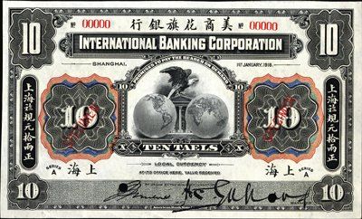 1918. P-S426s. 10 Taels Specimen banknote. Red specimen overprints, "00000" serial numbers and POC's. AU+ to Unc. with light paper bends keeping this note from choice Unc. Rare note. ABNC.