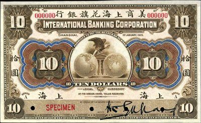 1905. P-S420s. $10. Specimen banknote. Eagle and globes. Red specimen overprint, POC's and "000000" serial numbers. Scarce note in great condition. Gem uncirculated with large even margins. ABNC