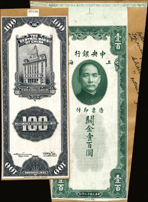 1930. P-329; 330 TC. 50; 100 CGU 2 different trial color proofs printed on india paper and mounted on manila card. Issued colors were purple for the 50 CGU note and red for the 100 CGU note. Both of these notes are in green for front and back except the 100 CGU back which is in black. Rare pair. ABNC.