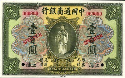 1920. P-1s; 3s; 4As; 5s; 6s; 7s; 8s. $1; $5; $5; $10; $10; $50; $100 7 different specimen banknotes from the same 1920 series. The $1 has 4 small staple holes on the left margin; P-6s, $10 red, has a small internal bend that is hardly visible and the $100 has a small corner bend that keeps it from Unc., otherwise the set ranges from AU to Choice Unc. Scarce set. ABNC.