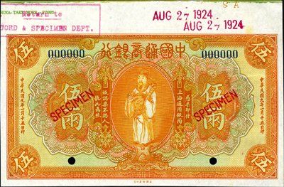 1920. P-A135s. $5 Specimen. Unc. To Choice Unc. Red specimen overprint, POC and "000000" serial numbers. Extra large top margin with purple hand stamped date "AUG 27 1924". ABNC.