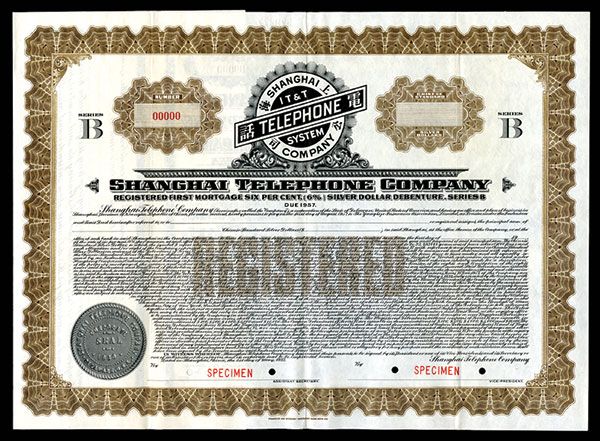 Shanghai, China, 1933. $-odd, 6% Registered First Mortgage Series B Bond, Gold border with Shanghai Company, ITT Telephone System Logo. Franklin-Lee-ABNCo Division specimen, VF, rare Chinese telephone bond.