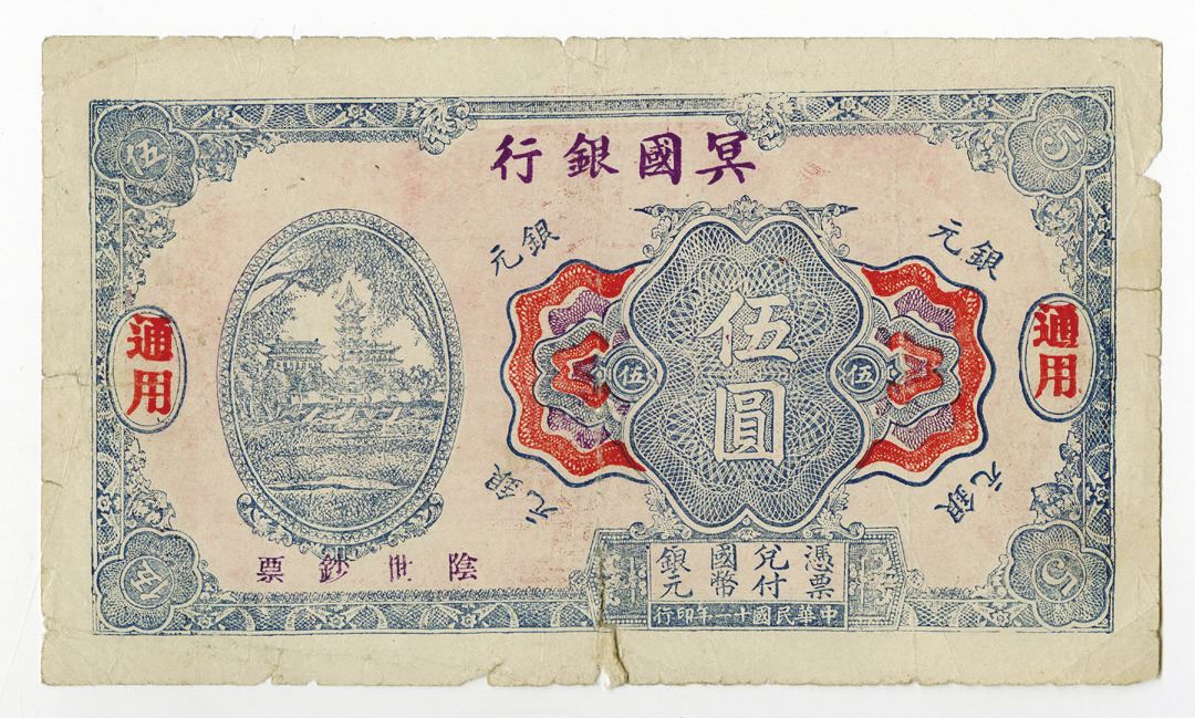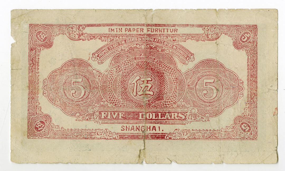 Shanghai, China, $5, P-Unlisted, blue on pink and red underprint, pagoda at left, Fine condition with paper faults on margins, otherwise a very attractive private issue.