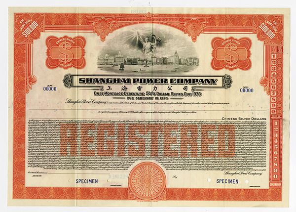 Shanghai, China, 1933, $-Odd, "Not More Than $100,000 Chinese Silver Dollars, Specimen Bond, Registered 5 1/2% 1st Mortgage Debenture Dollar Series Due 1973, panorama of Shanghai City and harbor. XF condition, ABNC. Rare Chinese Utility Specimen Bond.