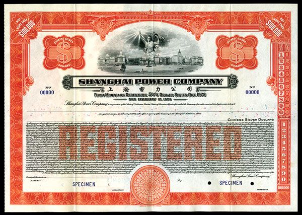 Shanghai, China, 1933, $-Odd (Not More Than $100,000) Chinese Silver Dollars, Specimen Bond, Registered 5 1/2% 1st Mortgage Debenture Dollar Series Due 1973. Black with orange border and underprint, allegorical young man with power generator behind him over panorama of Shanghai City and harbor. Specimen overprints, POC's, XF condition, ABNC. Rare Chinese Utility Specimen Bond.