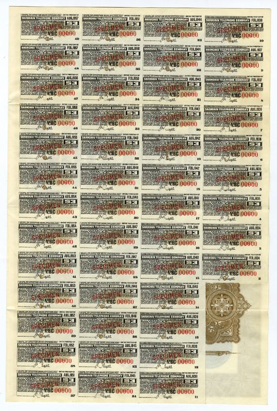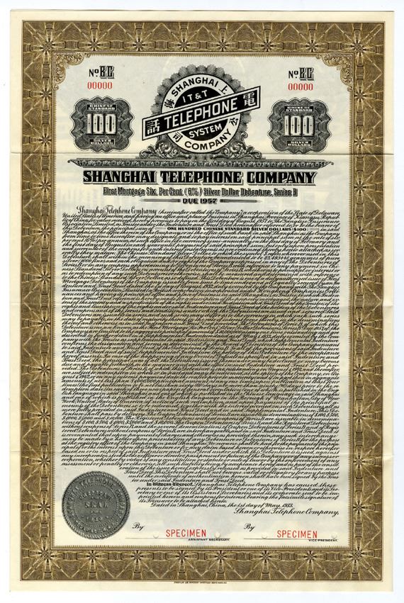 Shanghai, China. 1933. 100 Chinese Silver Dollars 6% Specimen 1st Mortgage Silver Dollar Debenture Series B Coupon Bond, Brown border with title of company logo of circle in Chinese and English with "IT&T System", Specimen overprints and POCs, "00000" serial numbers, VF to XF condition. Bond is in English. Rare Chinese-American Telephone Company Specimen bond. ABNC.