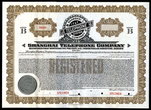 Shanghai, China, 1933, $-Odd, Specimen Registered 6% 1st Mortgage Silver Dollar Debenture, Series B, Brown border with title of company logo of circle in Chinese and English with “IT&T System”, No Coupons attached, Specimen overprints, “00000” serial numbers and POC's, XF. Bond is in English. Rare Chinese-American Telephone Company Specimen bond. ABNC.