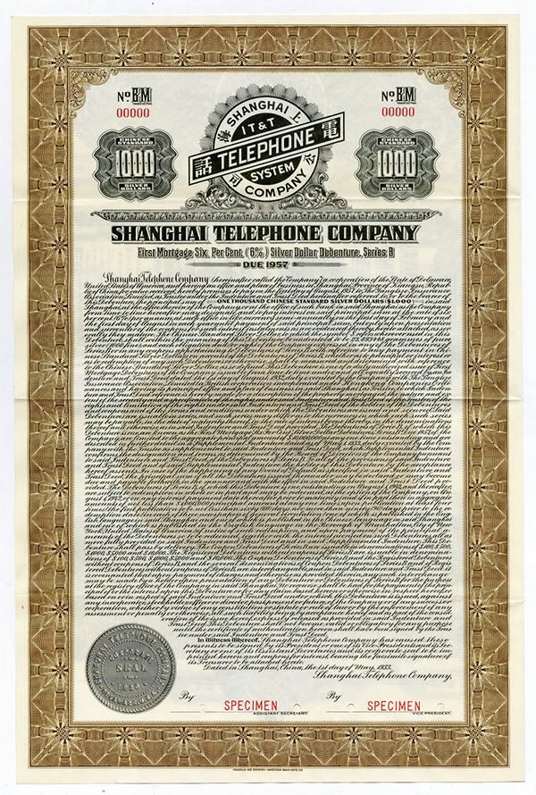 Shanghai, China. $1,000, Specimen 6% Series B 1st Mortgage Silver Dollar Debenture Coupon Bond, Brown border with title of company logo of circle in Chinese and English with "IT&T System", Coupons attached, Specimen overprints, "00000" serial numbers and POC's, XF condition. Bond is in English. Rare Chinese-American Telephone Company Specimen bond. ABNC.