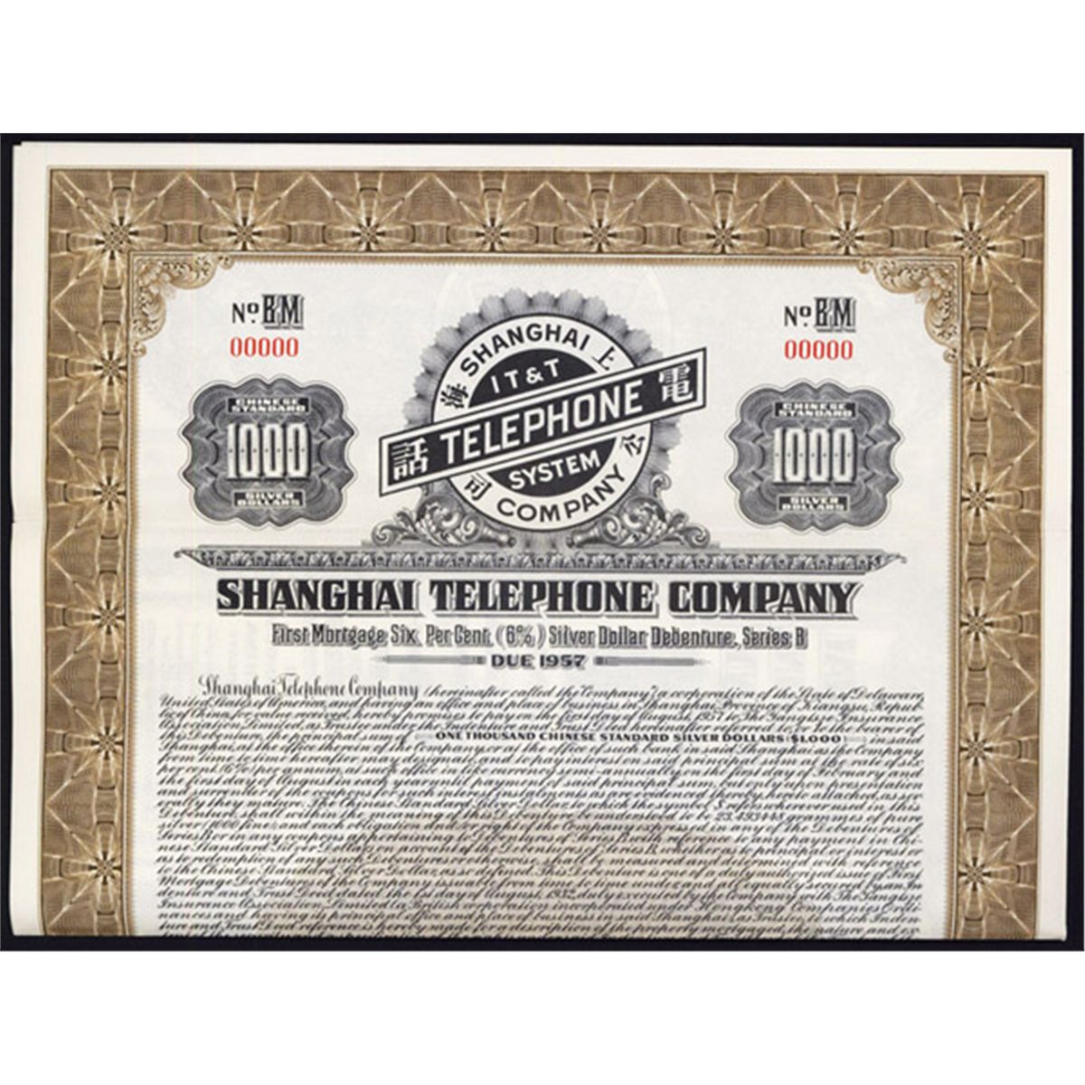 Shanghai, China, 1933. $1000 Chinese Standard Silver Dollars, 1st Mortgage 6% Silver Dollar specimen bond. Vignette of “Shanghai Telephone System “ logo in circle. Light brown borders, coupons attached. XF condition. Specimen overprints, “0000 “ serial numbers and POC's. Rare and attractive bond. Franklin Lee Division-ABNC.