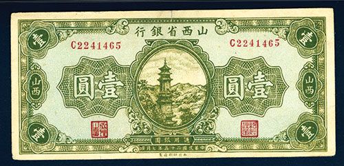 Shansi, China, 1936. 1 Yuan, P-S2677 (S/M#S23-99), Issued banknote, green on light blue underprint, PMG graded About Uncirculated 53, NWPF, printer.