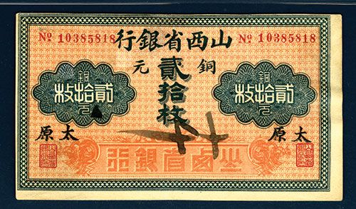 Taiyuan, China, ND (1924). 20 Coppers, P-S2634a (S/M#S23-21a), Issued banknote, Blue on pink underprint, PMG graded About Uncirculated 53 with two Chinese characters handwritten on the face.