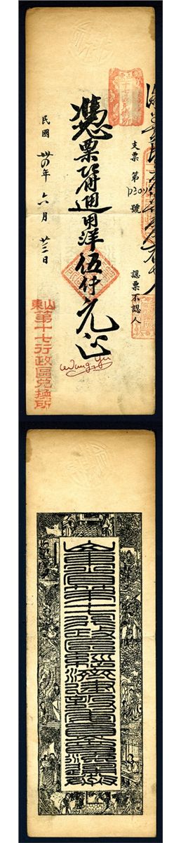 Shantung, China, 1945, June 23rd. Shantung 17th military District remittance cheque face value cash $5,000 with official signature. “Wang Yu”, On reverse printed by black wood block with fancy border and issuing authority inscriptions. Toning on top margin, otherwise appears VF, Scarce military related note.