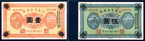 Lot of 2 notes, Both 1926 issued notes and both PMG graded, Includes 1 Yuan, P-S2718 (S/M#S43-10), Orange and yellow face, back violet with red overprint, Choice About Uncirculated 58; and, 5 Yuan, P-S2719 (S/M#S43-11), blue and green face, back green with large red overprint, About Uncirculated 55. Both are very attractive, are well centered and bright colors. Scarce notes. Printer SOPO.
