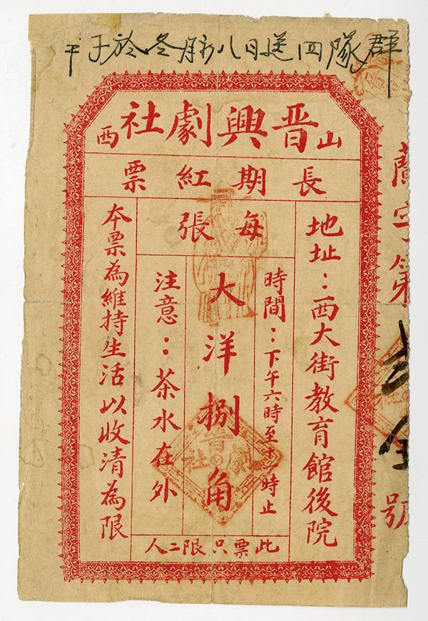 China. A long term ticket issued by the Jinxing Opera Troupe in Shanxi. No date. Top texts are "Shanxi Jinxing Opera Troupe" and "long term ticket". Texts below are the address, show time, price of the ticket (80 cents) and regulations. Seals are from the manager. Black writings on top is a record of sending this ticket as a gift. ____________________________________________________________________