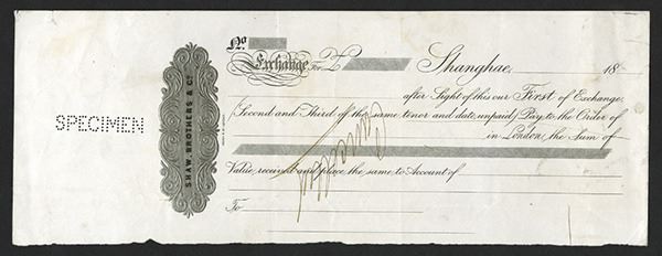 Shanghae (Shanghai early spelling), Specimen from Ashby & Co., London for the company Shaw Brothers & Co., Black printed on white paper with ornate title on left, First of Exchange, Pin-punch SPECIMEN on left counterfoil and hand written in ink “Cancelled” on face of exchange. VF to XF condition. Shanghai is spelled “SHANGHAE” with and “E” rather than an “I”. Scarce Chinese Exchange Specimen.