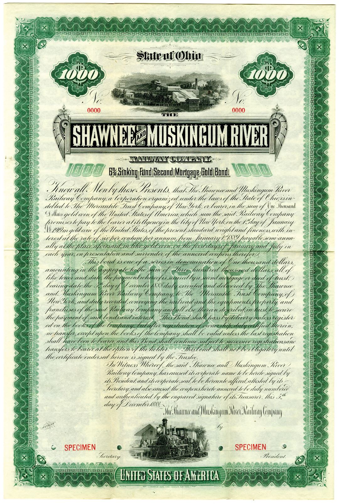 Ohio, 1888. $1000 Specimen 6% Sinking Fund Second Mortgage Gold Coupon Bond, Black text with green border and undertint, Railway in distance depicted at top center. Red specimen overprints, 0000 serial numbers, and POCs. Fine condition, ABNC. Unlisted color in Cox, only listed as a specimen in brown, Very Rare.