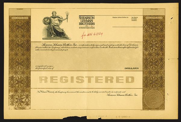 Delaware. $-Odd Proof Odd % Registered Bond, Black print on green border on brown paper, Allegorical woman at top next to company title, Fine-VF with chips missing along margins condition. Shearson was the name of a series of investment banking and retail brokerage firms from 1902 until 1994, named for Edward Shearson[1][2] and the firm he founded, Shearson Hammill & Co. Among Shearson's most notable incarnations were Shearson / American Express, Shearson Lehman / American Express, Shearson Lehman Brothers, Shearson Lehman Hutton and finally Smith Barney Shearson. For its first eight decades, the firm operated independently and merged with a number of Wall Street's most venerable securities firms including Hayden Stone & Co. and Loeb Rhoades & Co.. In 1981 Shearson was acquired by American Express and operated as a subsidiary of the financial services company before being merged with Lehman Brothers Kuhn Loeb in 1984 and E.F. Hutton & Co. in 1988. In 1993 Shearson was sold to Primerica, a predecessor of Citigroup, and merged with its retail brokerage business, Smith Barney, to create Smith Barney Shearson. The Shearson name was discontinued in 1994.