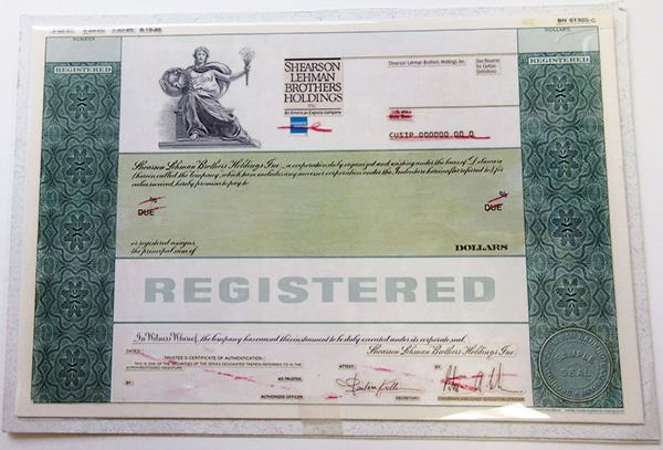 New York, 1985. $-Odd. Allegorical woman on left holding globe and torch. "Shearson Lehman Bothers Holding, Inc. - An American Express Company" title and logo in middle. The model is made up of pieces of border, text, and vignettes that were glued to a thin cardboard backing. Green side panels. Unique Proof model of Lehman certificate. SC-USBNC.