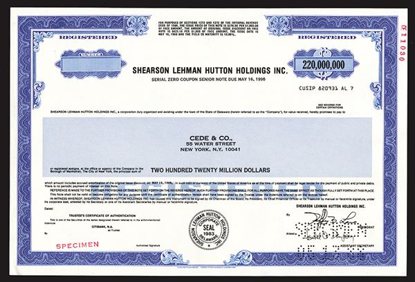 Delaware. $220,000,000 Registered Bond Specimen, made out to Cede & Co. Security-Columbian USBNC. EF+