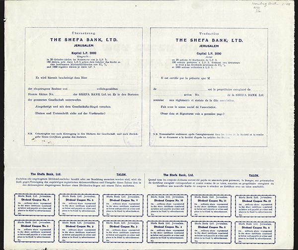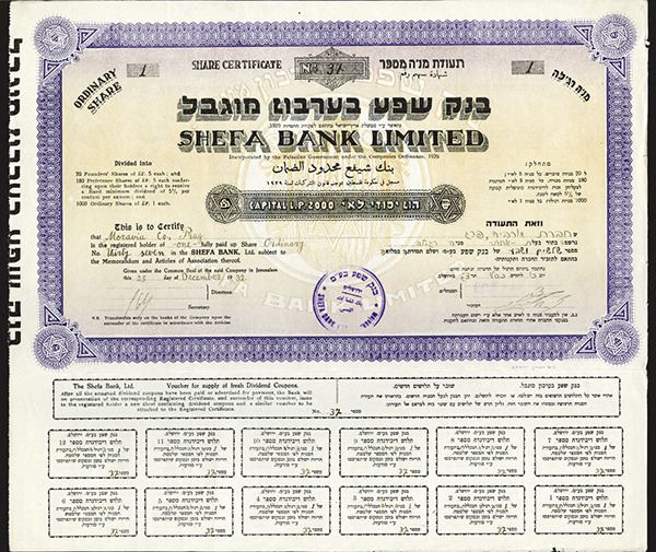 Palestine, Certificate for one ordinary share. Certificate number 37. Ornate purple border printed over yellow with bank seal in background. I/U, Fine