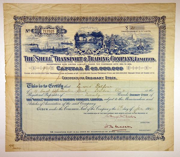 London, Great Britain�. �20 Issued Ordinary Stock certificate, blue print and blue border, featuring oil fields and ships at top, VF condition, BEB.