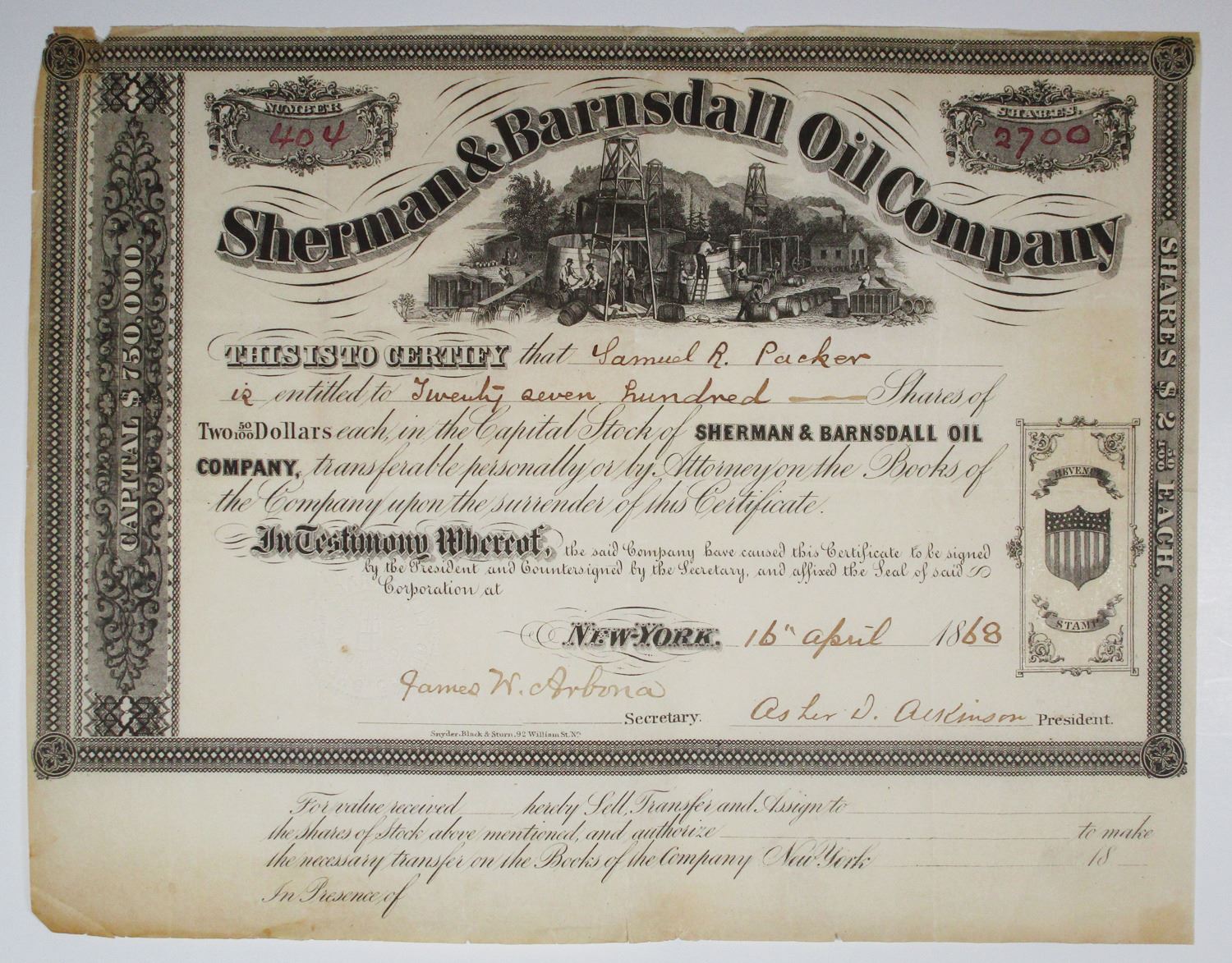 New YorkÉ. 1868. 2,700 Shares I/U Capital Stock Certificate, Black text with black border, Illustration of men working in oil field at top center. Fine condition with some toning and damage along margins.