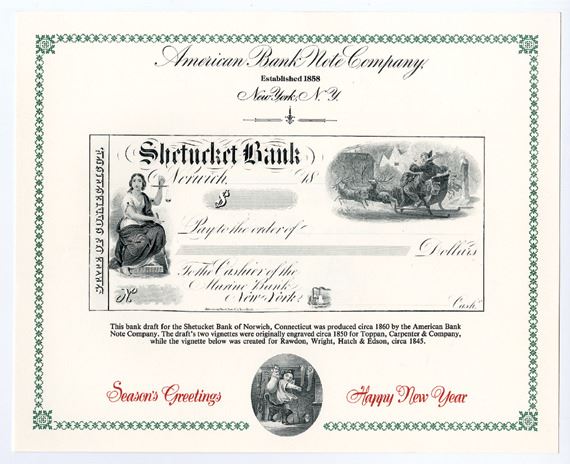 Norwich, Connecticut, 1993. Lot of 150+ Shetucket Bank Draft Reprints on Souvenir Cards with Santa Claus vignette as part of a "Seasons Greetings/Happy New Year." The 2 vignettes were originally engraved circa 1845-1850 for Toppan, Carpenter & Co. All Uncirculated as made, ABNC. (156 total with 69 coming in Original Envelopes ). Sold "AS IS" no returns accepted.