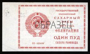 1924. 1 Pud. P-Unlisted. Specimen Sugar Loan Certificate. Pin punch Specimen in Cyrillic letters. Soviet Arms on left. Certificate printed in red with serial #'s BB -123456. Back has detailed text stating "If obligation not redeemed by 30 April 1924, the holder was entitled up to Sept. 30, 1924, to the money equivalent". Facsimile signature of Soviet President Mikhail Kalinin. Paper watermarked. AU-Unc. condition. Rare in any form.