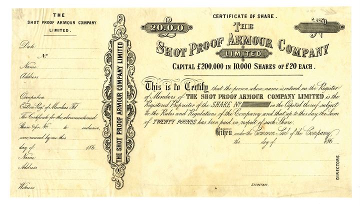 England. Odd Shares Capital Stock Specimen Certificate. Black print with a simple black design on left side of certificate. VF-XF condition. Interesting military related certificate. The title speaks for itself.