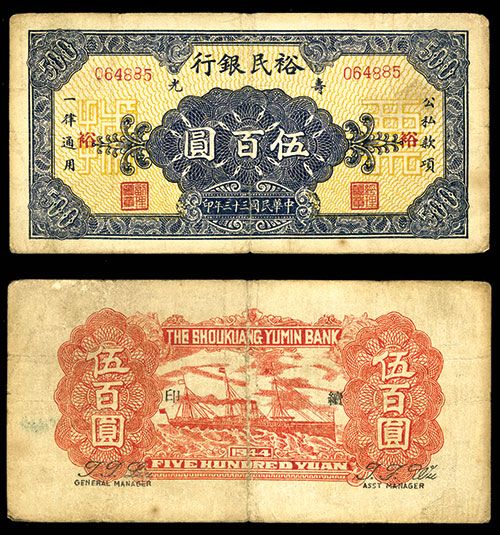 500 Yuan, P-Unlisted, Issued banknote, blue on light yellow, back orange with steamship, Fine to VF condition.