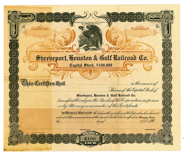 Manning, Texas and Louisiana. Odd Shares Capital Stock Specimen Certificate, Black print on black border with brown under tint, Bald Eagle at top, Included with stock is original order form for 100 copies of the certificate dated July 27, 1906, Fine-VF condition with toning over left side and splitting along fold lines, Clarke & Courts Galveston.