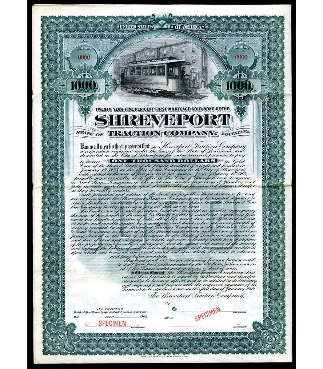Shreveport, LA. $1000, 1st Mortgage 5% Gold Bond, green border, street car on top. ABNC.