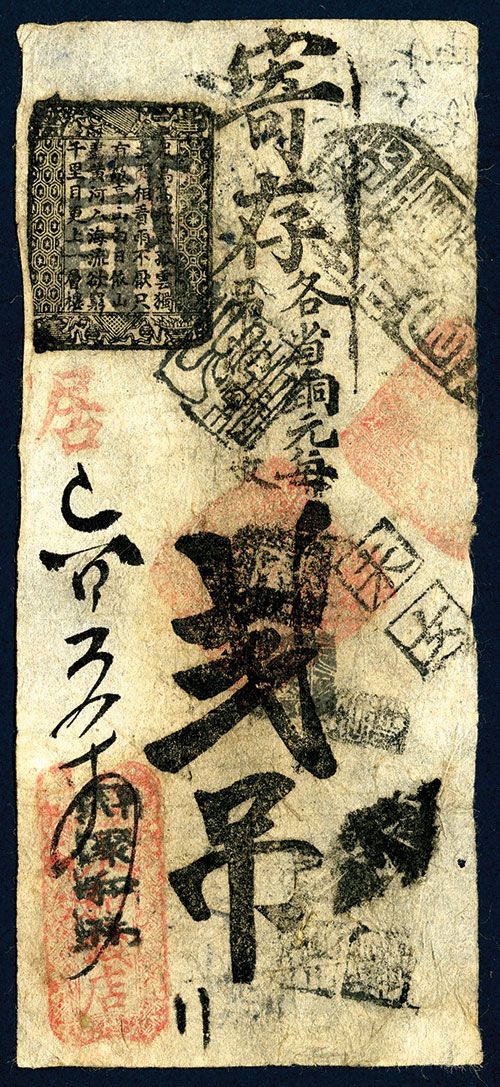 2 String (Copper), Private cash deposit note by Shui Wo company, cash deposited was 2 string with text stating each string equivalent to (illegible) Pieces, Fine to Choice Fine condition with pin holes near top, with various guarantee seal chops in black and red, dated Jun 29.