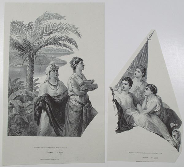 Sydney, N.S.W., Australia. Lot includes 2 pieces: 4.5 x 7 inch LDP Proof Vignette with a pair of women and palm tree in background, "Sidney International Exhibition, V-44757" imprint; Also includes 3.25 x 6 inch LDP Proof Vignette with a trio of women reclining, "Sidney International Exhibition, V-44765" imprint. 2 pieces in Uncirculated condition. ABN (2)