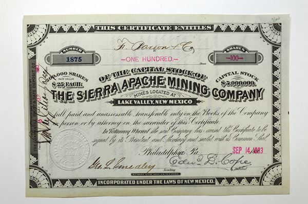 NM Territory. Sierra Apache Mining Co. 1883. 100 Shrs Stock Certificate. I/U. VF+