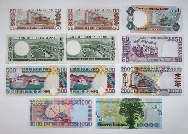 Sierra Leone.., ND (1964)-2003. Lot of 11 Issued Banknotes, includes: 50 Cents, 1, 50, 500, 1000, 2000, 10000 Leones . P-1a; 1b; 4a; 4e; 5e; 17b; 23a; 23c; 24a; 26b; 29a. Notes range from VF to CU condition. (11). Sold "AS IS" no returns accepted.