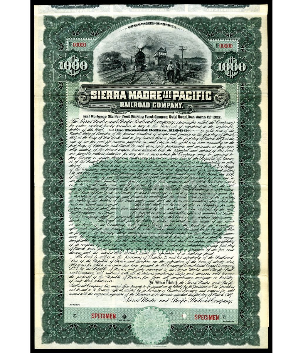 California, 1907. $1000. 1st Mortgage 6% Gold Coupon Bond Specimen. Green border and undertint. Locomotive head on passing workers and train station. XF condition. POC's. ABNC. Unlisted railroad in Cox. 1 of only 3 bonds found in the archives.