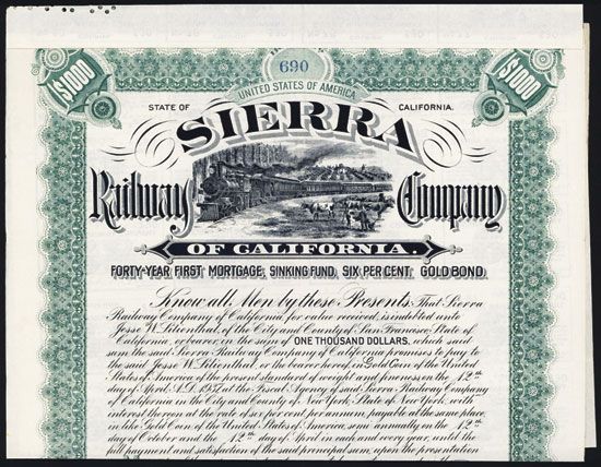 California, 1897, $1000, 40 Year 1st Mortgage Sinking Fund 6% Gold Bond, Issued and Cancelled Bond, #690, Black on green border and underprint, Vignette of moving locomotive with orchards and forest behind it and cows grazing in front, POC's, VF-XF condition, Lithography H.S. Crocker Co. A rare beautiful bond from the 1897 IPO, the company was formed to connect the California Central Valley to the Gold County foothills of the Sierra Nevada. Railroad and bond listed in Cox.