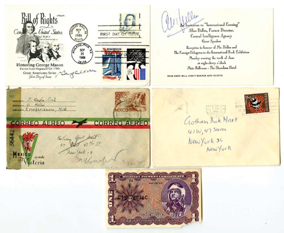 Various Locations......, Lot of 5 Autographs of notable 20th-century figures from the worlds of politics, intelligence, literature, and art. Includes autographs from Allen Dulles, the first civilian Director of the CIA; George C. Wallace, the four-time Governor of Alabama and presidential candidate; Ronald Greenaway, acclaimed artist; and Jacquelin Onslow Ford, writer. VF to XF condition. (5). Sold "AS IS" no returns accepted.