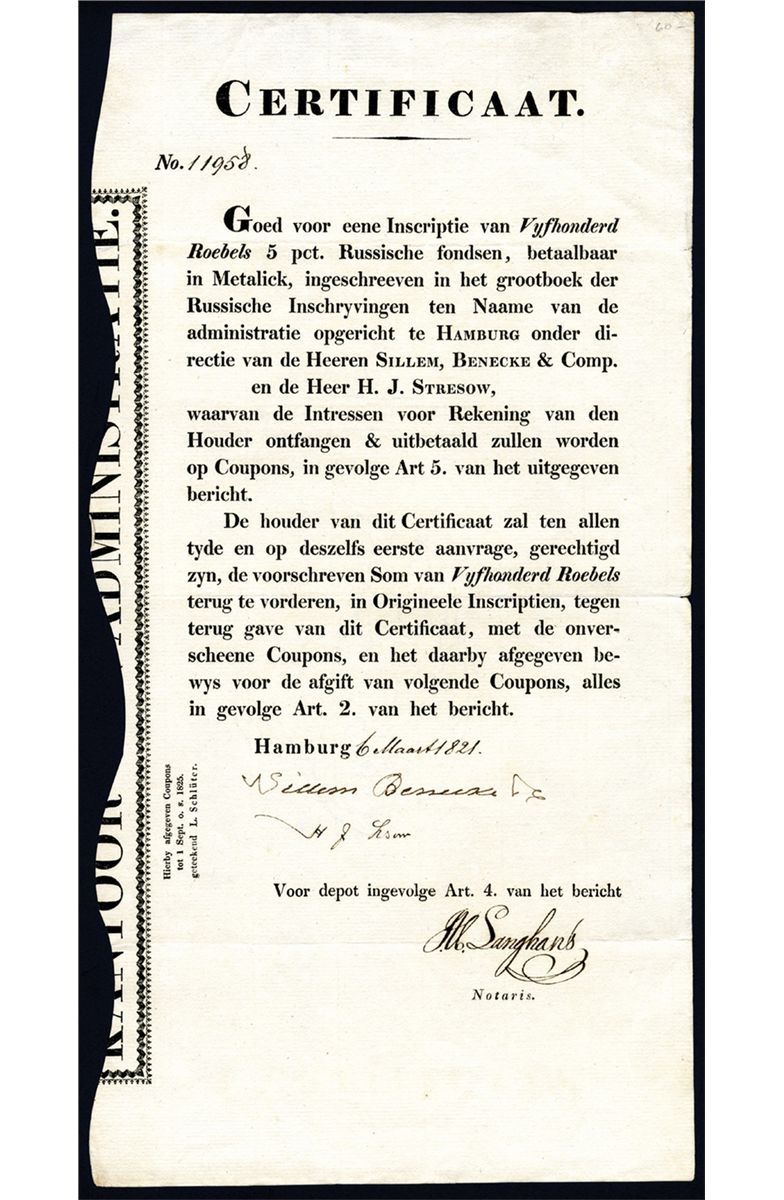 Netherlands, 1821, 500 Roubles 5% Issued Bond, #11958, VF condition.
