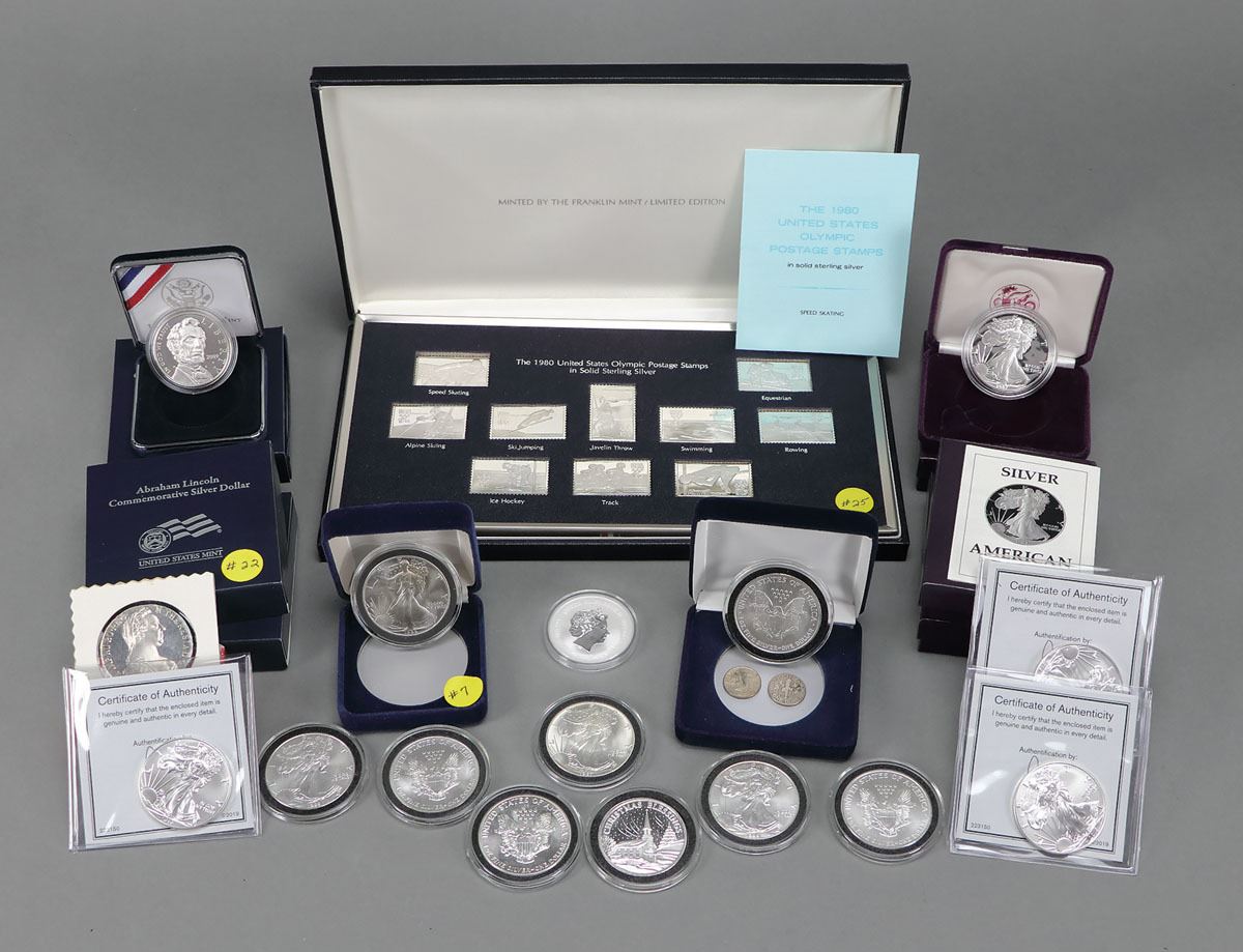 20 coins in total, 14 of which are 99.9% Silver Bullion American Eagle Coins in Uncirculated and Proof condition dating 1986-2019; also included are two private issue 1 ounce silver bullion coins as well as a 1 ounce Maria Theresa Dollar and three Abraham Lincoln Commemorative Silver Dollars, as well as 1980 U.S. Olympic Game Solid Sterling Silver Postage Stamps in original case appearing in proof condition. (over 38 ounces of silver). Shipping charges apply - weight 5.2 lbs. (photo on web site)