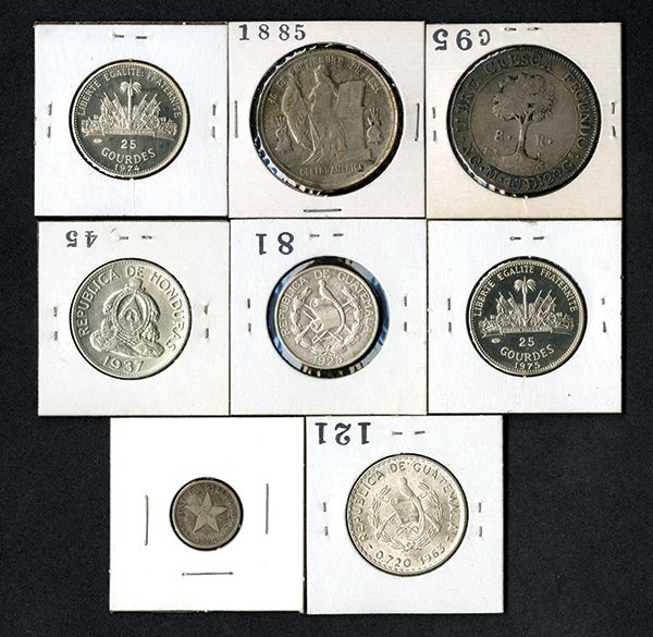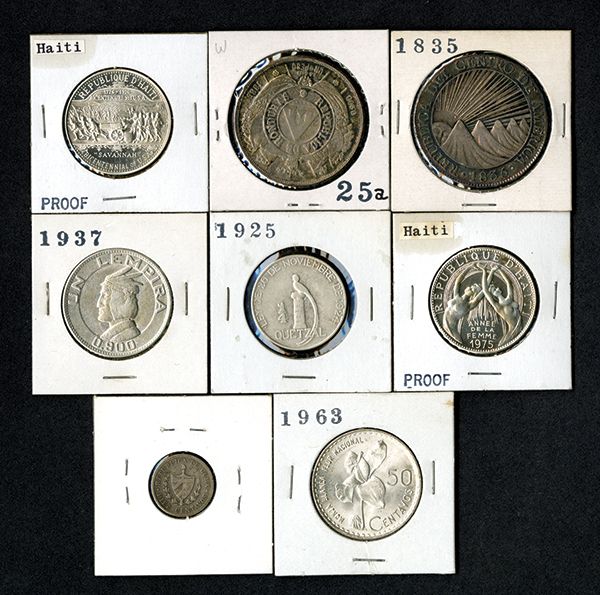 Silver Coins from Central America, Mostly. Central American Republic 1835 8 Reales NG M coin EF; Cuba 1920 10 Centavos Fine; Guatemala 1925 1 Quetzal EF; 1963 50 Centavos Unc; Honduras 1885 1 Peso VF; Haiti 1974 & 1975 25 Gourdes Proof; Honduras 1937 Lempira AU; Guatemala 1925 1 Quetzal EF; 1963 50 Centavos Unc; [8]