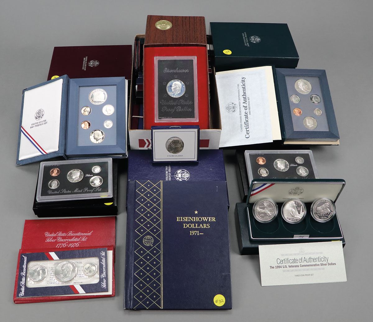 over 40 Uncirculated and Proof singles and sets, most include silver dollars and half dollars or are part of prestige sets, all in CU to Superb Proof condition; commemoratives include the White House 200th Anniversary coin; Thomas Jefferson 250th Anniversary Dollar; 1992 Olympics; 1995 Special Olympics World Games; U.S. Constitution coins; 1983 Olympic Dollars; Eisenhower Centennial Silver dollar, and many more; estimated over 25 ounces of silver. (40+). Shipping charges apply - weight 19 lbs. (photo on web site)